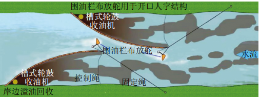 如果溢油表面流速超過臨界流速,以一定形狀固定的圍油欄就很難發(fā)揮圍控作用。這就需要圍油欄也沿水流方向運動。用拖船沿兩邊分別牽引圍油欄的一端,使其在激流中保持穩(wěn)定運動,并保持與溢油的相對速度小于圍油欄失效臨界速度,這樣溢油就被完全圍控在圍油欄U形區(qū)域內(nèi),待轉(zhuǎn)移到水流平緩之處就可以回收溢油。