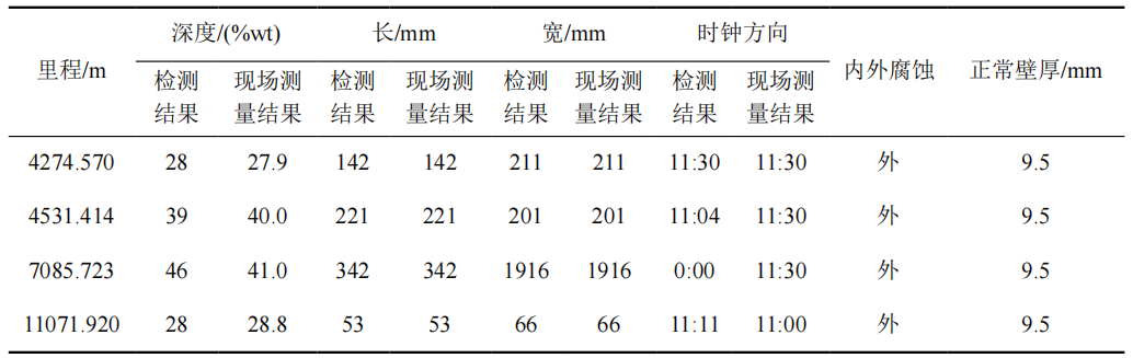 對(duì)比4處開(kāi)挖驗(yàn)證點(diǎn),深度誤差分別為0.1%、1.0%、5.0%、0.8%,均遠(yuǎn)小于10%,缺陷深度檢測(cè)結(jié)果符合驗(yàn)收要求;缺陷長(zhǎng)度與寬度檢測(cè)結(jié)果與現(xiàn)場(chǎng)測(cè)量結(jié)果一致,符合驗(yàn)收要求;缺陷點(diǎn)最大偏差15°,符合驗(yàn)收要求。