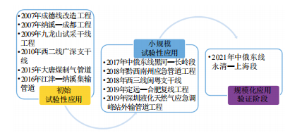 DR檢測(cè)在長(zhǎng)輸管道行業(yè)的應(yīng)用是一個(gè)不斷摸索的過(guò)程,經(jīng)歷了初始試驗(yàn)性應(yīng)用、小規(guī)模試驗(yàn)性應(yīng)用以及規(guī);瘧(yīng)用驗(yàn)證三個(gè)階段,發(fā)展歷程見(jiàn)圖 3。