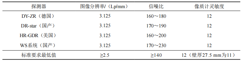 (2)圖像質(zhì)量,F(xiàn)場(chǎng)分別采用2套國(guó)外進(jìn)口探測(cè)器和2套國(guó)產(chǎn)探測(cè)器,4套檢測(cè)系統(tǒng)的圖像質(zhì)量都滿足SY/T 4109―2020《石油天然氣鋼質(zhì)管道無(wú)損檢測(cè) 》標(biāo)準(zhǔn)要求。圖像主要質(zhì)量指標(biāo)如表 1所示。