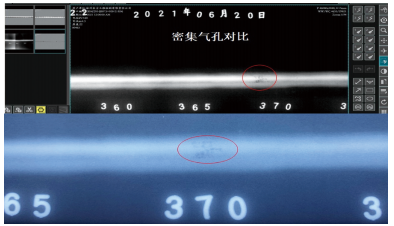 通過(guò)對(duì)成品圖像對(duì)比可知,由于DR無(wú)劃傷和水跡等偽缺欠對(duì)圖像的干擾,其成像質(zhì)量要遠(yuǎn)高于傳統(tǒng)RT膠片,進(jìn)而可減少缺陷誤判。此外對(duì)DR圖像進(jìn)行增強(qiáng)處理后,對(duì)小缺欠的可識(shí)別度也高于RT底片, 二者形成的圖像對(duì)比見(jiàn)圖 5。
