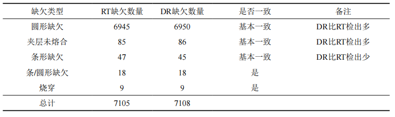 (3)缺陷檢出率。將DR焊口檢測(cè)結(jié)果與RT檢測(cè)結(jié)果進(jìn)行了對(duì)比,由于自動(dòng)焊焊接產(chǎn)生的主要缺欠是未熔合和氣孔,在缺欠檢出量、缺欠定性和缺欠尺寸三個(gè)方面一致性非常高。DR檢出數(shù)量略高于RT,見(jiàn)表 2所列。