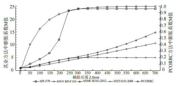 采用文獻(xiàn)[11]中的數(shù)據(jù)進(jìn)行分析,分別使用ASME B31G―2012、DNV RP-F101、PCORRC、SY/T 6151―2009、API-579來對比腐蝕長度L對膨脹系數(shù)M的影響,如圖 2所示。