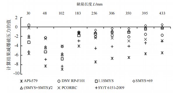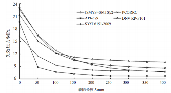 (2)當(dāng)缺陷長度小于某一數(shù)值時,上述五種方法的評價保守性從低到高依次為DNV RP-F101、PCORRC、ASME B31G-2012、SY/T 6151―2009、API-579;大于該值時,總體來說評價方法的保守性從低到高依次為B31G、DNV RP-F101、PCORRC、SY/T 6151―2009、API-579。