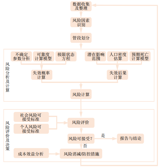 定量風(fēng)險(xiǎn)評(píng)價(jià)(Quantitative Risk Assessment,QRA)是將管道的失效概率和失效后果進(jìn)行定量計(jì)算,通過數(shù)值表明所評(píng)價(jià)對(duì)象的危險(xiǎn)程度,實(shí)現(xiàn)對(duì)管道風(fēng)險(xiǎn)的精確描述,以便科學(xué)地確定風(fēng)險(xiǎn)防控和消減措施,最大限度減少事故發(fā)生所造成的經(jīng)濟(jì)損失、人員傷亡和對(duì)環(huán)境的破壞。定量風(fēng)險(xiǎn)評(píng)價(jià)結(jié)果的精度取決于數(shù)據(jù)資料的完整性和精度、數(shù)學(xué)模型和分析方法的合理性。評(píng)價(jià)過程主要包括數(shù)據(jù)收集、風(fēng)險(xiǎn)識(shí)別、管段劃分、失效概率和失效后果計(jì)算、風(fēng)險(xiǎn)計(jì)算、風(fēng)險(xiǎn)評(píng)價(jià)和決策等,其核心是管道失效概率和失效后果的計(jì)算。