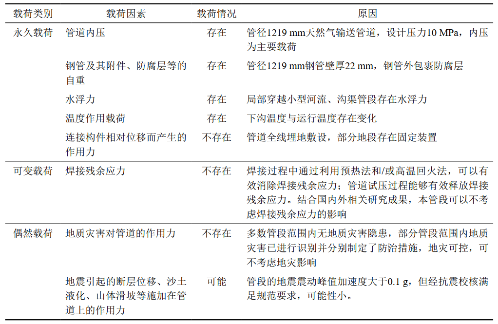中俄東線天然氣管道(永清—上海)為埋地敷設(shè),在運(yùn)行過程中可能同時(shí)出現(xiàn)永久載荷、可變載荷和偶然載荷。結(jié)合泰安—泰興段管道的敷設(shè)情況,對(duì)上述可能出現(xiàn)的載荷分析如表 1所示。