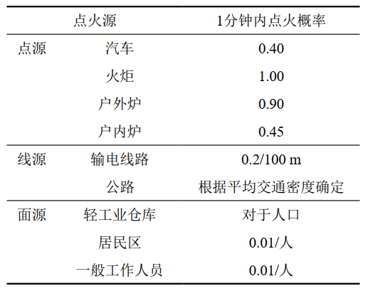 點(diǎn)火概率按一定時(shí)間間隔的點(diǎn)火概率計(jì)算,表 4給出了涉及本次特定場(chǎng)所點(diǎn)火源在1分鐘時(shí)間間隔點(diǎn)火的概率。