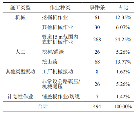通過事件復(fù)核及現(xiàn)場反饋,全年共發(fā)現(xiàn)預(yù)警事件494次,其中主要為機械施工占比72.67%(圖 3),人工挖掘施工占比19.01%。表明預(yù)警能夠?qū)C械事件和人工深層次挖掘、持續(xù)性挖掘及作業(yè)計劃事件進行準(zhǔn)確預(yù)警與定位。