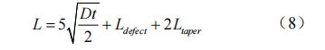 式中L為復材套筒軸向最小寬度,mm;Ldefect為缺陷軸向?qū)挾龋琺m;Ltaper為復材套筒邊界斜坡寬度,mm;Ltaper為最小值,取5;t為管道壁厚,mm。