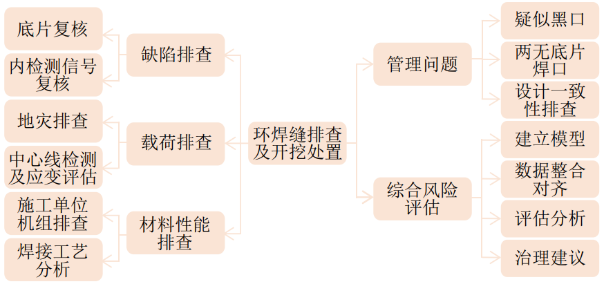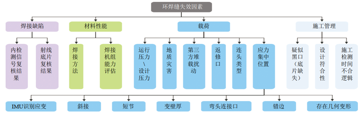 鑒于環(huán)焊縫失效的復(fù)雜性,為充分識(shí)別風(fēng)險(xiǎn)隱患,從環(huán)焊縫缺陷、載荷作用、材料性能、施工管理、綜合風(fēng)險(xiǎn)評(píng)估等方面排查失效原因。見(jiàn)圖 1?茖W(xué)精準(zhǔn)制定開(kāi)挖原則和計(jì)劃,提高開(kāi)挖的準(zhǔn)確率,節(jié)約開(kāi)挖成本。