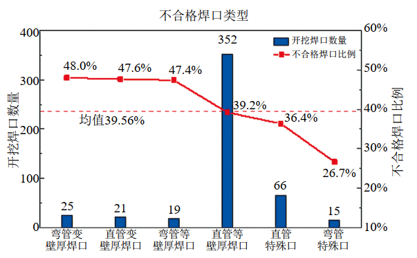 管理問(wèn)題排查。檢查與焊口相關(guān)的竣工資料和內(nèi)檢測(cè)資料,排查施工記錄、監(jiān)理記錄、無(wú)損檢測(cè)報(bào)告的符合性和一致性,上溯施工管理問(wèn)題。如果環(huán)焊縫查不到對(duì)應(yīng)的施工記錄、檢測(cè)報(bào)告和射線底片,需對(duì)其進(jìn)行開(kāi)挖檢測(cè)。對(duì)存在較多不合格焊口和修復(fù)焊口的施工隊(duì)伍,要加大其焊口開(kāi)挖量。