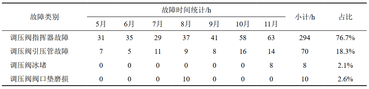 某公司管道工程投產(chǎn)運(yùn)行以來,輸氣站調(diào)壓閥故障頻發(fā),造成檢修工作量大幅增加,人工成本和維修成本增高。經(jīng)對2018年5月至2018年11月調(diào)壓閥出現(xiàn)的各種故障進(jìn)行調(diào)查統(tǒng)計(表 1),調(diào)壓閥實(shí)際運(yùn)行時間為4658 h,發(fā)生各類故障共計382 h,設(shè)備故障率為7.58%,未達(dá)到工藝設(shè)備設(shè)施月故障率不高于5%的標(biāo)準(zhǔn)要求。