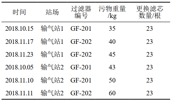 (1)過濾分離器濾芯更換情況。2018年5—11月兩個輸氣站過濾分離器濾芯更換記錄顯示, 5—9月沒有進(jìn)行更換,而10—11月每站更換3次(表 2)。
