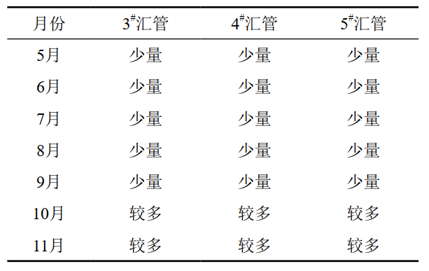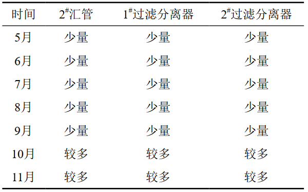 (2)過濾分離器及其上游匯管排污情況。5—9月污物較少,10—11月污物較多(表 3)。