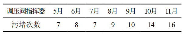 (3)調(diào)壓閥指揮器污堵情況。5—9月每月7~10次,10—11月每月14~16次(表 4)。