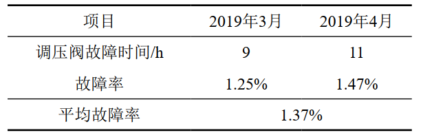 經(jīng)統(tǒng)計,2019年3—4月調(diào)壓閥故障率由之前的7.58%降低到1.37%,故障率顯著降低(表 6)。
