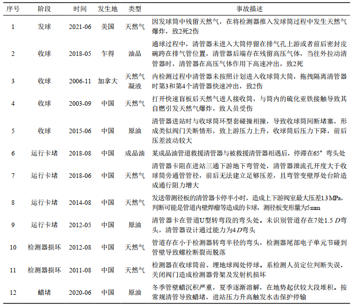 管道內(nèi)檢測(cè)實(shí)施前,應(yīng)制定適合的內(nèi)檢測(cè)工作流程,包括內(nèi)檢測(cè)技術(shù)與設(shè)備選型、檢測(cè)器性能驗(yàn)證、踏線設(shè)標(biāo)、管道清管/測(cè)徑、運(yùn)行檢測(cè)器、數(shù)據(jù)分析和開挖驗(yàn)證,其中清管和內(nèi)檢測(cè)階段風(fēng)險(xiǎn)最大。影響檢測(cè)器正常運(yùn)行的因素較多,包括管道收發(fā)球裝置尺寸和結(jié)構(gòu)、管道管徑、三通、閥門、彎頭和管道壓力、流量以及現(xiàn)場操作等。近年國內(nèi)外開展內(nèi)檢測(cè)(含清管)作業(yè)出現(xiàn)了諸如收發(fā)球過程中的火災(zāi)、殘留高壓氣體引起的設(shè)備沖撞、運(yùn)行過程中的卡停等事故事件(表 1),造成人員傷亡和設(shè)備損壞。對(duì)此需要引起重視,作業(yè)時(shí)應(yīng)全面識(shí)別項(xiàng)目實(shí)施過程中存在的風(fēng)險(xiǎn)因素,采取消減和控制措施,擬定異常情況的應(yīng)急處置預(yù)案,確保檢測(cè)工作順利實(shí)施。