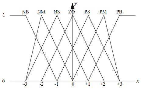 模糊PID控制技術(shù)把天然氣輸配系統(tǒng)中壓力、溫度的模擬量信號(hào)轉(zhuǎn)換成實(shí)型數(shù)據(jù),設(shè)置四限報(bào)警(高高、高、低、低低),PV調(diào)節(jié)閥閥位模擬信號(hào)轉(zhuǎn)換成整型數(shù)據(jù)用于控制設(shè)計(jì)。模糊推理模型主要通過對(duì)PID的誤差(ER)和誤差變化率(EC)進(jìn)行計(jì)算,輸出合理的參數(shù)給PID控制器進(jìn)行調(diào)節(jié)。模糊增量PID控制將誤差及誤差變化分為正大(PB)、正中(PM)、正。≒S)、零(ZO)、負(fù)。∟S)、負(fù)中(NM)、負(fù)大(NB)7個(gè)模糊集,采用三角分布作為隸屬度函數(shù)[7](圖 2)。