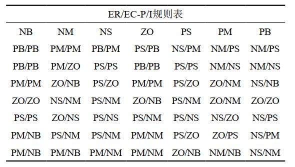 在對(duì)調(diào)節(jié)后壓力曲線的實(shí)際追蹤過程中,在保證調(diào)節(jié)曲線收斂的情況下進(jìn)行控制規(guī)則的設(shè)計(jì),模糊PID控制規(guī)則如下:以正向調(diào)節(jié)為例(即誤差為正),誤差先后經(jīng)歷正大到負(fù)大、負(fù)大到正小、正小到零直至趨近穩(wěn)定的幾個(gè)區(qū)域,而相應(yīng)誤差變化則先后經(jīng)歷負(fù)大至零再至正大、負(fù)中至零再至正小,最后為零并趨近穩(wěn)定的幾個(gè)區(qū)域,而反向調(diào)節(jié)則區(qū)間不變,正負(fù)相反。模糊規(guī)則表[7]如表 1所示。