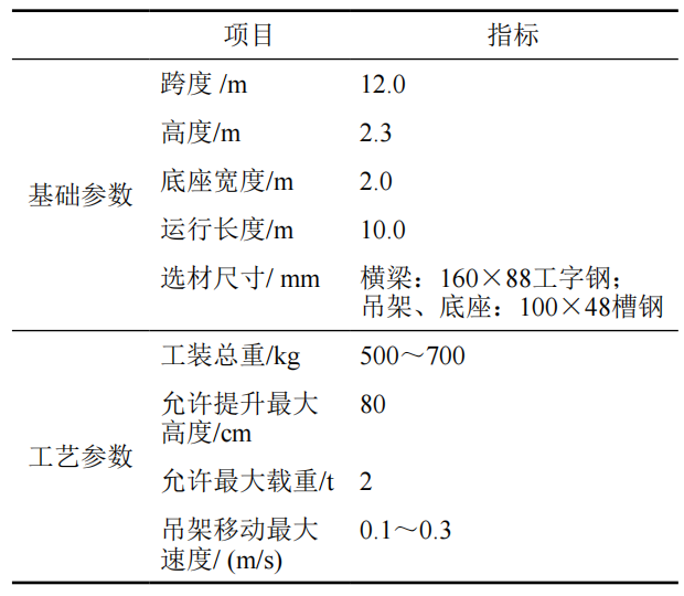 表 1 隧道專用龍門架基礎(chǔ)參數(shù)及工藝參數(shù)