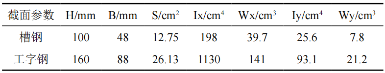 龍門架主體結(jié)構(gòu)由100 mm×48 mm槽鋼焊接而成,其手拉葫蘆所在橫梁及主體結(jié)構(gòu)下方的導(dǎo)軌采用160 mm×88 mm工字鋼,導(dǎo)軌與固定底座用螺栓連接。根據(jù)型鋼尺寸得知龍門架骨架基本截面參數(shù)如表 2所示。其中槽鋼構(gòu)成龍門架的主體結(jié)構(gòu),工字鋼為龍門架提供移動(dòng)導(dǎo)軌和承重作用。