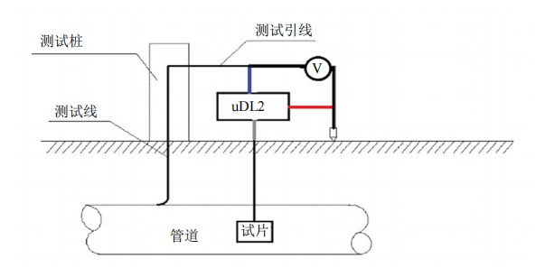 (1)電位測試。采用uDL2數(shù)據(jù)記錄儀與陰極保護試片(探頭)測試閥室管道與接地網(wǎng)(摘除前和摘除后)通電電位、交流電壓、試片瞬間斷電電位變化等。將管道、試片、參比電極對應接入uDL2,其自動一次性采集通電電位、斷電電位、交流電壓和交流電流密度(圖 1)。