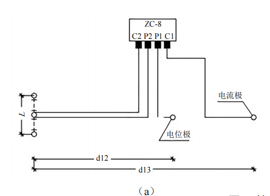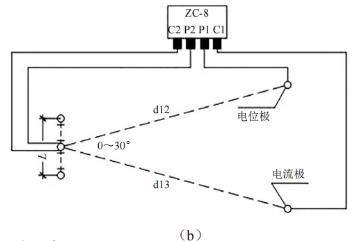 (1)接地電阻測試。采用三角形布極法測量接地系統(tǒng)的接地電阻。如圖 2 a所示,在土壤電阻率較均勻的地區(qū),d13取2 L,d12取L;在土壤電阻率不均勻的地區(qū),d13取3 L,d12取1.7 L(圖 2 b)。測量過程中電位極沿接地體與電流極的連線移動三次,每次移動距離為d13的5%左右,若三次測試值接近,取其平均值作為長接地體的接地電阻值;若測試值不一致,將電位極往電流極方向移動,直至測試值接近為止。長接地體的接地電阻也可以采用圖 2所示三角形布極法測試,此時 d13= d12≥2 L。