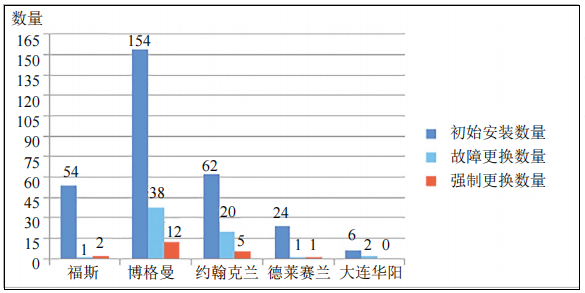 如針對西二、三線永昌和古浪站聯(lián)合運(yùn)行多重因素造成的干氣密封故障問題,統(tǒng)計了各站場不同廠家的干氣密封故障更換數(shù)量或強(qiáng)制更換數(shù)量,與初始安裝數(shù)量進(jìn)行了對比,結(jié)果如圖 2所示。