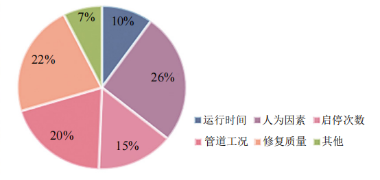 從圖 3可以看出,人為操作因素、密封修復(fù)質(zhì)量、管道工況、啟停次數(shù)是密封故障的主要因素,合計占比為83%,其次是離心壓縮機(jī)組運(yùn)行時間和其他因素占17%。
