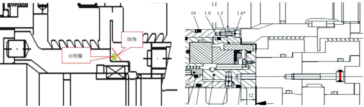 (7)結(jié)合密封失效情況和密封裝配結(jié)構(gòu)形式,對干氣密封螺母與連接軸套之間進(jìn)行了改進(jìn),新增加一道O型圈密封,以增強(qiáng)其密封效果,有效防止隔離密封的密封性下降對干氣密封的影響,如圖 4所示。
