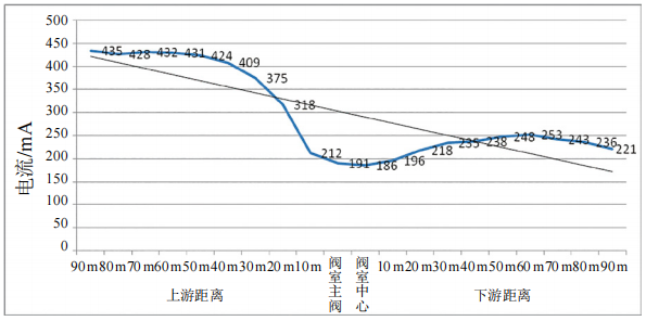 選用克烏復(fù)線閥室作為測試對象,使用DM接收機(jī)沿管道每隔10 m測量管中電流值,如圖 1電流變化曲線顯示,前期為均勻衰減,在經(jīng)過閥室時電流值明顯陡降,經(jīng)過閥室后電位也明顯下降,說明克烏復(fù)線閥室內(nèi)存在漏電。