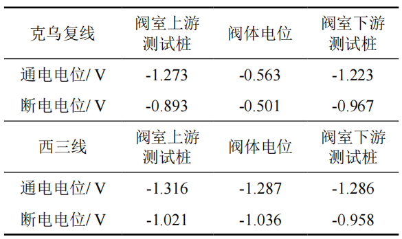 (3)閥室內(nèi)外管道電位對比法 。分別對克烏復(fù)線閥室和西三線閥室內(nèi)外管道電位進(jìn)行測量,結(jié)果如表 1所示?梢姡藶鯊(fù)線閥室內(nèi)外管道電位存在明顯電位差,說明閥室內(nèi)部有明顯電流流失,發(fā)生閥室漏電。西三線閥室內(nèi)外管道電位差別微小,不存在電流流失,閥室電位正常。