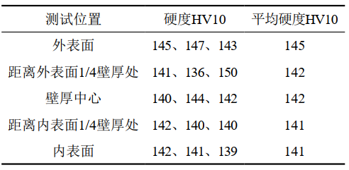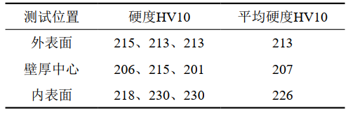 采用TH140硬度計對現(xiàn)場低強度X70三通進(jìn)行硬度測試,測試標(biāo)準(zhǔn)執(zhí)行GB/T 17394-2014《金屬材料 里氏硬度試驗 第1部分:試驗方法》,結(jié)果見表 2。低強度三通由于溫度梯度較小導(dǎo)致其表面和心部性能差異較小。表 3為某X80三通硬度測試結(jié)果。對比表 2和表 3,無論正常和異常三通,外表面強度均大于心部強度,外表面不合格則心部必然不合格。