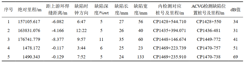 針對(duì)梳理的19處外部金屬損失缺陷點(diǎn),開展ACVG防腐層地面檢漏,發(fā)現(xiàn)5處防腐層缺陷點(diǎn)與內(nèi)檢測(cè)里程位置一致,詳見(jiàn)表 2。