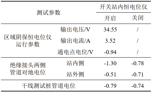 圖 3和表 1以西部某原油管道出站絕緣接頭內(nèi)外側(cè)電位測(cè)試數(shù)據(jù)為例,依次判斷區(qū)域陰極保護(hù)系統(tǒng)和線(xiàn)路陰極保護(hù)系統(tǒng)的相互干擾情況。