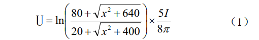 參比電極受到干擾將造成陰保數(shù)據(jù)收集不準(zhǔn)確,恒電位儀輸出不穩(wěn)定最終造成陰極保護(hù)系統(tǒng)失效。受周邊復(fù)雜空間電場(chǎng)影響,參比電極存在明顯的直流干擾。采用由遠(yuǎn)及近,再由近至遠(yuǎn)的方式測(cè)量并行管道參比電極測(cè)點(diǎn)處電壓偏移值并進(jìn)行定量分析,結(jié)果如圖 2所示。建立空間電場(chǎng)變化對(duì)參比電極干擾模型如圖 3所示。