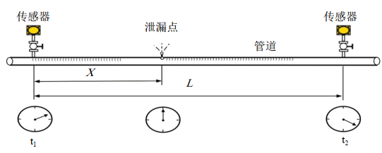 次聲波泄漏監(jiān)測通過計算泄漏信號傳輸?shù)桨惭b在管段兩端傳感器的時間差,結合信號在流體中的傳輸速度,計算泄漏點位置,如圖 1 所示。