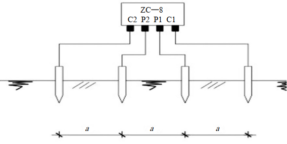 使用ZC-8 接地電阻測量儀按等距法測試管道埋深 2 m處土壤電阻率。使用接地電阻測量儀按四極法測試測量點(diǎn)土壤電阻率,如圖 2所示。