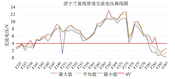 從圖 4 看出:該管段內(nèi)F243#—F282#區(qū)段平均交流電壓超過4 V;其余均小于4 V,交流干擾程度為“弱”。