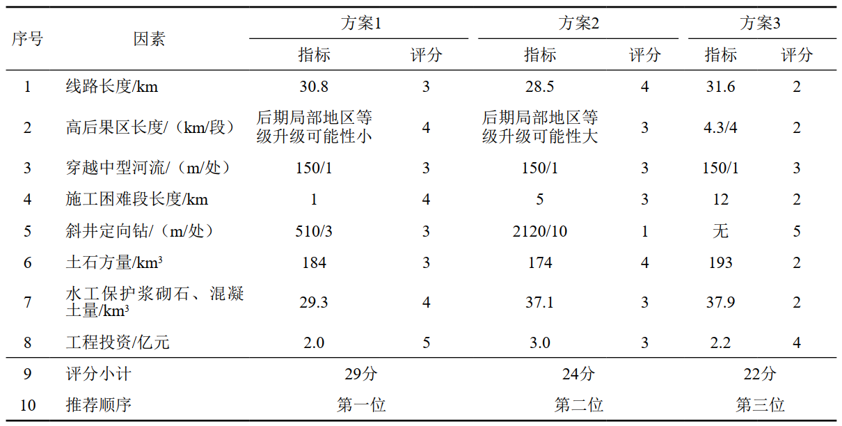 (3)方案比選。通過對(duì)不同路由方案的各相關(guān)因素進(jìn)行統(tǒng)計(jì)分析與比較,排序推薦,為有關(guān)部門決策提供支持和依據(jù)。例如,某輸氣管道在項(xiàng)目前期可行性研究中,根據(jù)現(xiàn)場(chǎng)地形地貌、施工難度等條件,對(duì)某段管道提出三個(gè)路由方案進(jìn)行比選(表 1、圖 1)。
