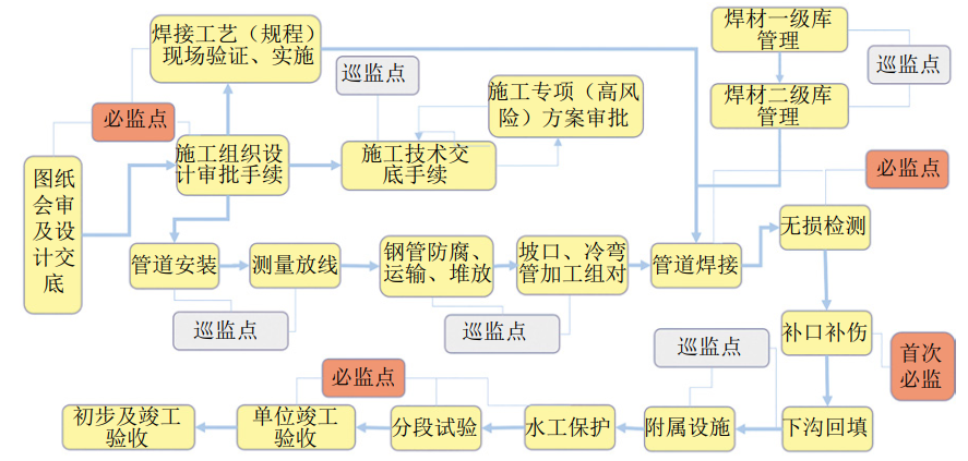 例如,某管道工程于2021年開工建設(shè)前,建設(shè)單位依據(jù)《特種設(shè)備安全監(jiān)察條例》和TSG D7006―2020《壓力管道監(jiān)督檢驗(yàn)規(guī)則》、國(guó)家管網(wǎng)集團(tuán)《工程建設(shè)項(xiàng)目質(zhì)量管理暫行規(guī)范》《油氣管道工程質(zhì)量監(jiān)督實(shí)施規(guī)定》,建立了工程質(zhì)量監(jiān)督體系。一是主動(dòng)接受屬地政府的質(zhì)量監(jiān)督,項(xiàng)目開工前向?qū)俚卣O(jiān)檢機(jī)構(gòu)申請(qǐng)質(zhì)量監(jiān)督注冊(cè),由屬地政府安排省特檢院(高配)承擔(dān)管道建設(shè)質(zhì)量監(jiān)督,實(shí)施對(duì)壓力管道施工過程質(zhì)量監(jiān)督和滿足基本安全要求的符合性驗(yàn)證,確保管道建設(shè)階段質(zhì)量可控。二是積極配合國(guó)家管網(wǎng)集團(tuán)內(nèi)部質(zhì)量監(jiān)督,向集團(tuán)工程質(zhì)量監(jiān)督總站申請(qǐng)項(xiàng)目質(zhì)量監(jiān)督注冊(cè)。監(jiān)督總站安排質(zhì)量監(jiān)督分站實(shí)施質(zhì)量監(jiān)督。在國(guó)家管網(wǎng)集團(tuán)和社會(huì)監(jiān)理共同監(jiān)督中,依據(jù)設(shè)置的管道線路、穿越、站場(chǎng)等工程質(zhì)量監(jiān)督要點(diǎn)(圖 2),2022年5月共檢查出設(shè)計(jì)、施工、檢測(cè)、監(jiān)理和建設(shè)單位質(zhì)量問題29項(xiàng),其中質(zhì)量實(shí)體8項(xiàng)、質(zhì)量行為14項(xiàng)、HSE問題7項(xiàng)。這些監(jiān)督檢查有效推動(dòng)了質(zhì)量保證體系的運(yùn)行,糾正了施工過程中的質(zhì)量安全偏差,起到了積極作用。