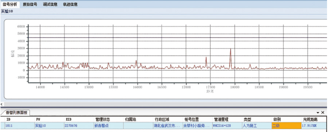 圖 4 光纜振動檢測儀上顯示的振動信號及測試長度