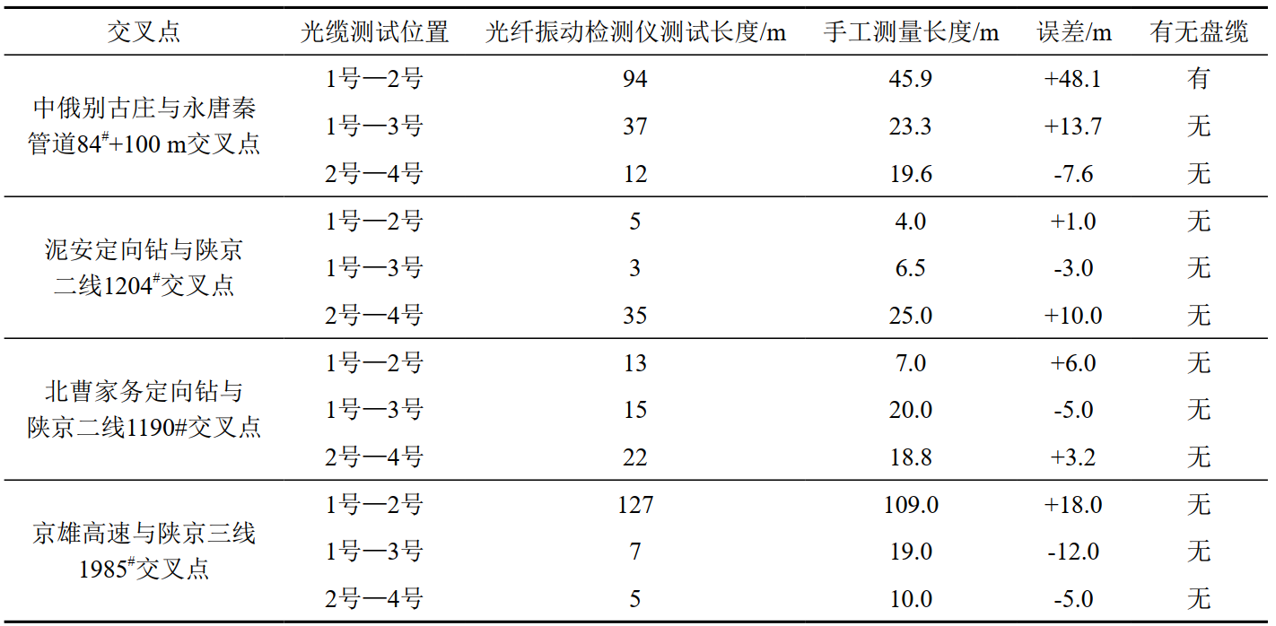 ( 2)應(yīng)用現(xiàn)狀。截止目前,光纜四點定位法已應(yīng)用在京安城際高鐵、南水北調(diào)、京德高速、京雄高速、榮烏高速、中俄管道、唐山LNG、北燃管道等工程與陜京管道交叉的43處施工現(xiàn)場,實現(xiàn)了光纜準(zhǔn)確定位和盤纜有效排查。其中,在京安城際高鐵與陜京二線管道交叉點周邊開挖探坑時,共發(fā)現(xiàn)了4條光纜,通過上述方法及時排查廢棄光纜,確定在用光纜及其位置信息,保證了施工作業(yè)光纜安全。表 2選取4組光纜振動檢測儀測試長度與手工測量長度進行對比。