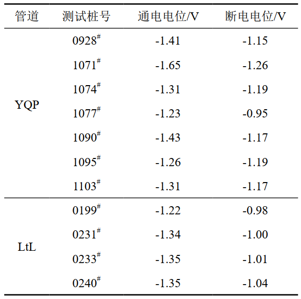 表 1 管道通電電位和斷電電位測試結(jié)果