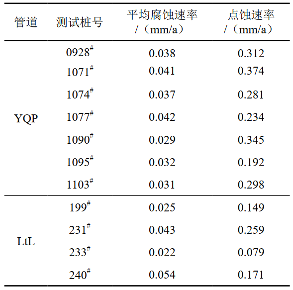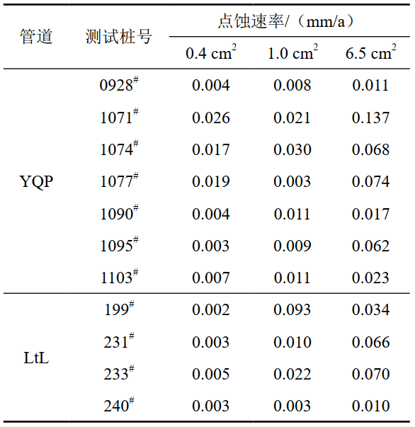 以YQP管道928#、1074#和1077#這3處為例,自腐蝕試樣點蝕速率和陰極保護(hù)試樣最大點蝕速率分別為0.312 mm/a,0.011 mm/a;0.281 mm/a, 0.068 mm/a;0.234 mm/a,0.074 mm/a。根據(jù)GB/T 21447-2018《鋼質(zhì)管道外腐蝕控制規(guī)范》,3處土壤腐蝕性等級均為中,施加陰極保護(hù)后均降為弱?梢钥闯觯帢O保護(hù)試樣點蝕速率遠(yuǎn)遠(yuǎn)小于沒有陰極保護(hù)的自腐蝕試樣點蝕速率,表明試驗管段陰極保護(hù)系統(tǒng)可以大幅度降低管道腐蝕速率,為管道提供良好保護(hù)。