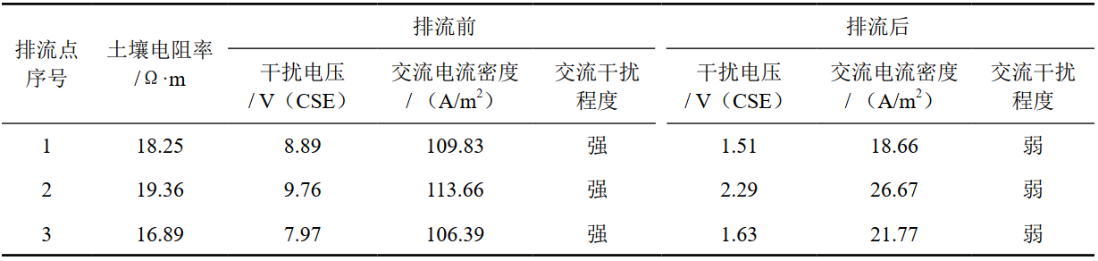 與高壓交流輸電線路并行敷設(shè)的管道,與110 kV及以上輸電線最外側(cè)邊導(dǎo)線間距小于300 m且累計(jì)長度超過2 km的管段,應(yīng)進(jìn)行交流感應(yīng)電壓排流防護(hù)。平泰管道與220 kV上都高壓輸電線路并行且交叉,與最外側(cè)邊導(dǎo)線間距小于300 m范圍內(nèi)管道長度約2.3 km,故共設(shè)置3處排流點(diǎn),排流防護(hù)采用固態(tài)去耦合器和裸銅線,裸銅線沿管道兩側(cè)敷設(shè)。排流防護(hù)結(jié)果如表 1所示。