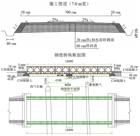 ( 2)施工前需要先完成便道施工。便道采用磚渣和混凝土組成,跨越天然氣管道處采用擴(kuò)大基礎(chǔ)+下承式鋼便橋方式。如圖 4所示。