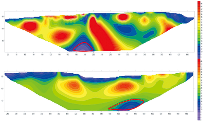管道附近共完成5條高密度電法剖面(分別為W1、W2、W3、W4和W5測(cè)線),可探測(cè)有效深度根據(jù)剖面長(zhǎng)短而定。依據(jù)高密度電法反演成果圖,對(duì)礦區(qū)采空區(qū)進(jìn)行分析。以W1測(cè)線為例,根據(jù)現(xiàn)場(chǎng)踏勘推測(cè)采空區(qū)范圍在里程120 m~200 m和390 m~600 m之間。里程170 m~220 m標(biāo)高22 m~40 m存在視電阻率值小于15 Ω·m區(qū)域,推測(cè)該位置為采空區(qū),采空區(qū)頂板位置大約在標(biāo)高40 m處。同理,里程485 m~590 m標(biāo)高14 m~44 m地層視電阻率值小于15 Ω·m,推測(cè)該位置為采空區(qū),采空區(qū)頂板位置大約在標(biāo)高44 m處(圖 5)。