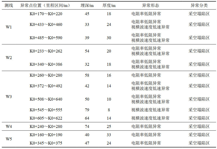 通過(guò)布置5條高密度電法測(cè)線和40個(gè)微動(dòng)測(cè)試點(diǎn),經(jīng)過(guò)處理和分析,局部地段存在視橫波速度低速帶、電阻率低阻帶等異常,以此推測(cè)場(chǎng)區(qū)13處物探異常點(diǎn)為采空區(qū)位置,如表 1所示。