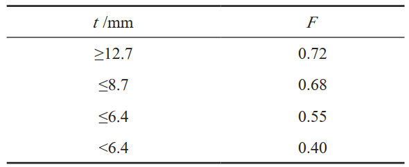 式中:P為管道允許帶壓施焊的壓力,MPa;σs為管材的最小屈服極限,MPa;t為焊接處管道實(shí)際壁厚,mm;c為因焊接引起的壁厚修正量,取值見表 1,mm;D為管道外徑,mm ;F為安全系數(shù),取值見表 2。